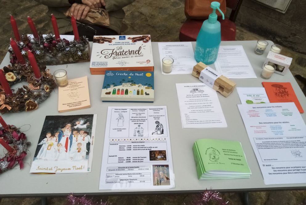 La paroisse a participé au marché de Noël du dimanche 19 décembre à Clamecy. Les nombreux promeneurs, d’ici et d’ailleurs, ont été accueillis autour d’un stand présentant les diverses propositions et activités de notre paroisse et ont été invités à découvrir la crèche installée par les enfants du catéchisme dans la cour du presbytère.