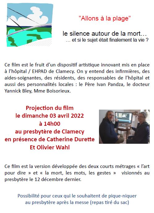 Nous pourrons nous retrouver au presbytère de Clamecy le dimanche 03 avril pour visionner la version développée “Allons à la plage” des deux courts métrages « l’art pour dire » et « la mort, les mots, les gestes ».