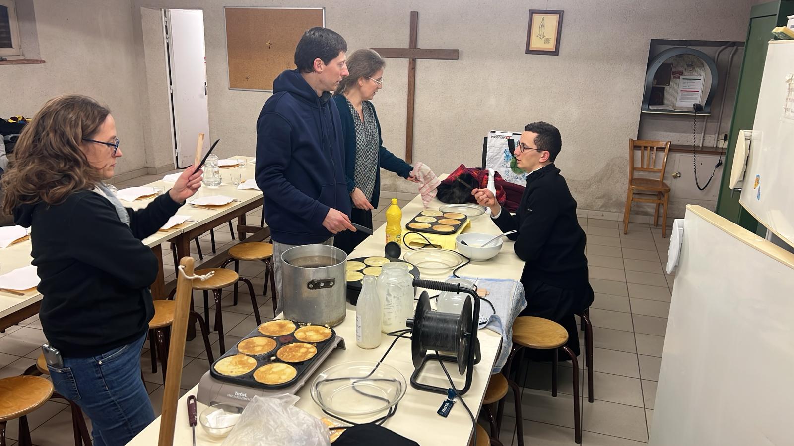 Après un temps de foot et de jeux, retour à l’abbaye pour un temps d’adoration, à la fin duquel chaque participant est béni personnellement par le Saint Sacrement. C’est d’ailleurs un des moments qui a le plus marqué les jeunes mais aussi les adultes qui les accompagnaient. Après les vêpres avec les moines, un dîner crêpes pantagruélique attendait tout le monde (7 litres de pâte, tout de même !). La soirée a été l’occasion de jouer à des jeux de société tous ensemble.